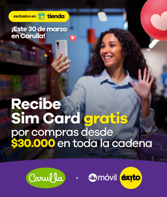 Oferta válida por compras realizadas el 30 de marzo de 2023 en Carulla. no aplica en otros almacenes o cadenas. Aplica en sim card Móvil Éxito (PLU: 4425 - 3921), 500 unidades disponibles a nivel nacional. Descuento no es acumulable con otras ofertas. Aplica por compras superiores $30.000 en el Almacén, en una única transacción. La sim card y las compras deben ser registrados y pagados en la misma transacción. Conoce más en www.movilexito.com