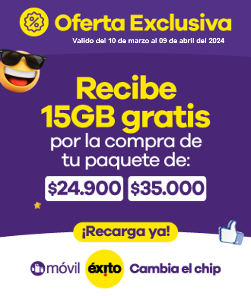 Oferta segmentada a líneas contactadas por Móvil Éxito por medio de mensaje de texto (SMS). válida del 10 de marzo de 2024 al 9 de marzo de 2024 o hasta agotar existencias. 500 unidades disponibles a nivel nacional. Recibe 15GB (Gigabytes) promocionales por la compra de los paquetes relacionados. El paquete Móvil Éxito® se activa desde tu compra y desde ese momento empiezas a contabilizar su vigencia. Válido por la compra del paquete $24.900 (PLU 332403) y $35.000 (PLU 3085868). Aplica en todos los almacenes de Grupo Éxito, página web www.movilexito.com y puntos autorizados por fuera de Grupo Éxito. No aplica en call center. La vigencia de los recursos promocionales es de 30 días, o hasta consumir los recursos, lo que suceda primero. No es acumulable con otras ofertas. Los recursos promocionales pueden ser cargados hasta 72 horas después de la recarga. Aplica para usuarios Móvil Éxito. IVA incluido. Aplica una sola vez por cliente. Consulta condiciones de navegación y cobertura en 5G y 4G LTE Móvil Éxito en www.movilexito.com. Cuando utilizas el servicio de Móvil Éxito suscribes un acuerdo bajo los términos y condiciones Móvil Éxito®, consúltalos en www.movilexito.com. Prácticas de buen uso: Los paquetes de Móvil Éxito están habilitados únicamente para el consumo personal, no aplica para uso corporativo o actividades comerciales, si se detecta el uso no debido de este servicio será cual causal de cancelación o migración automática a otro plan