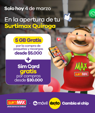 Oferta válida por compras realizadas el 04 de marzo de 2023 en Surtimax Quiroga, no aplica en otros almacenes o cadenas. Aplica en Sim Card Móvil Éxito (PLU 4425 y 3921), 500 unidades disponibles a nivel nacional. Descuento no es acumulable con otras ofertas. Aplica por compras superiores $30.000 en el Almacén, en una única transacción. La Sim Card y las compras deben ser registrados y pagados en la misma transacción. 200 unidades disponibles para cada paquete. No es acumulable con otras ofertas. Válido para la compra/activación de los Paquetes $5.000 (PLU 227132), Paquete $7.500 (PLU 3337864). Paquete $9.900 (PLU 330271), Paquete $19.900 (PLU 595633), Paquete $24.900 (PLU 332403), Paquete $35.000 (PLU 3085868), Prepagada $59.700 (PLU 1741695), Prepagada $74.700 (PLU 1844089), Prepagada $105.000 (PLU 3092311). Válido para recargas en dinero desde $5.000 (PLU 959966). Los datos promocionales pueden ser cargados hasta 72 horas después de la recarga. La vigencia de los datos promocionales es de siete (7) días, o hasta consumir los recursos, lo que suceda primero. Conoce más en www.movilexito.com.